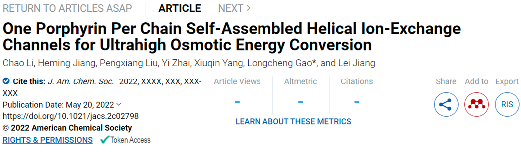 2022年5月20日,Journal of the American Chemical Society 在线发表了Beat365江雷院士、高龙成副教授团队在高效离子交换膜方面的最新研究成果:“One Porphyrin Per Chain Self-Assembled Helical Ion-Exchange Channels for Ultrahigh Osmotic Energy Conversion”。Beat365唯一官方网站博士生李超为第一作者,高龙成副教授为通讯作者,Beat365唯一官方网站为第一单位。