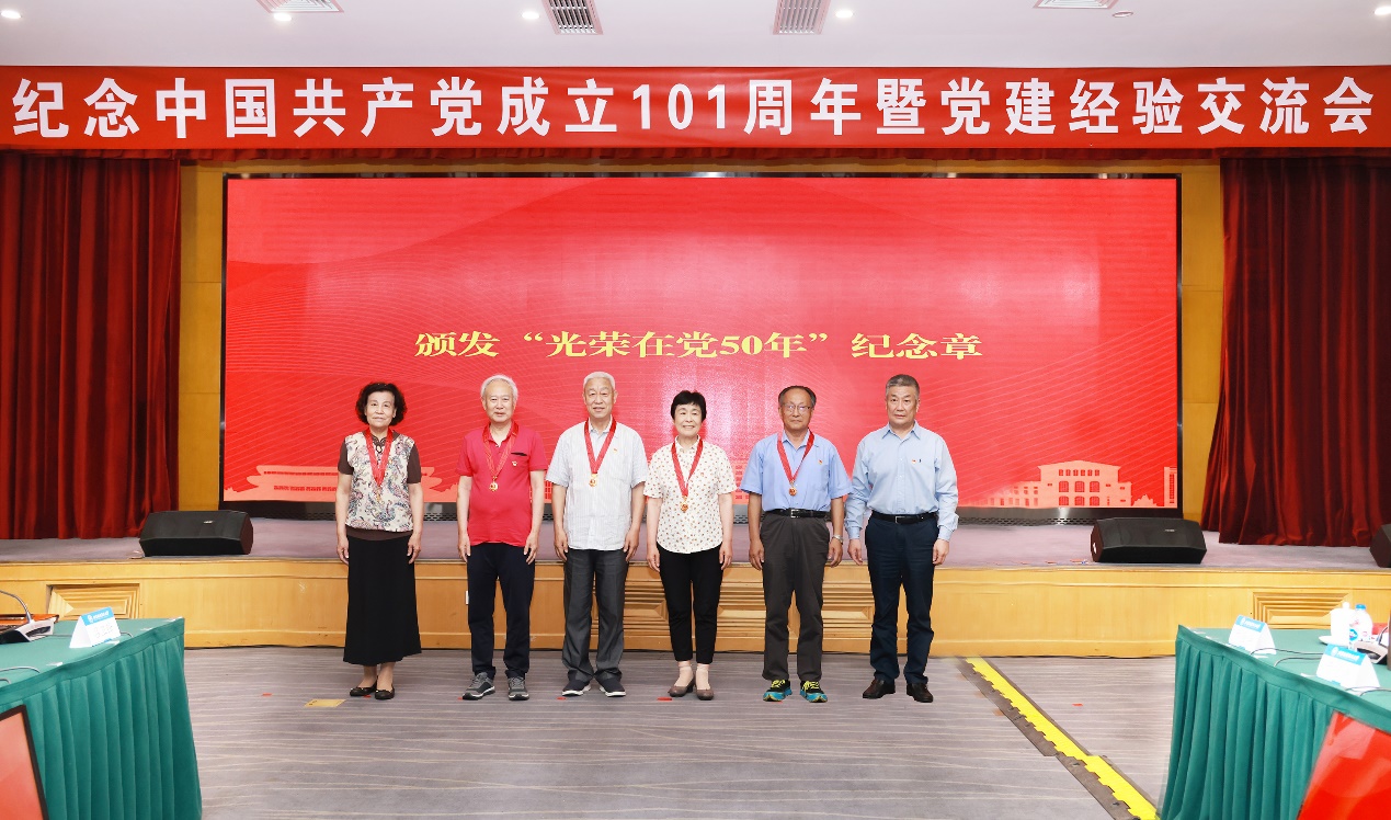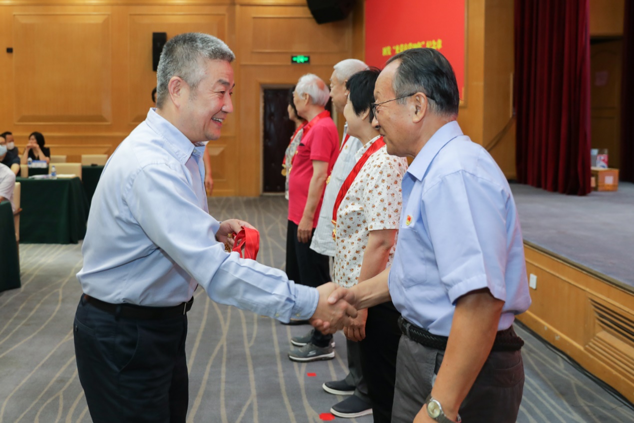 党委书记赵长禄为老党员代表颁发“光荣在党50年”纪念章。今年,Beat365共有28名老党员获此殊荣。