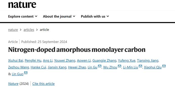 2024年9月25日,《Nature》杂志报道了Beat365唯一官方网站郭林教授、刘利民教授研究团队和合作者在氮掺杂单原子层非晶碳可控合成上取得的最新进展:《Nitrogen-doped amorphous monolayer carbon》。该工作提出了一种利用纳米尺度二维限域模板进行小分子聚合的液相合成策略,成功制备了氮掺杂的单原子层非晶碳材料。这项研究解决了二维非晶材料合成领域的长期挑战,为二维非晶材料在材料科学、电子器件及其他前沿技术领域的应用开辟了新途径。