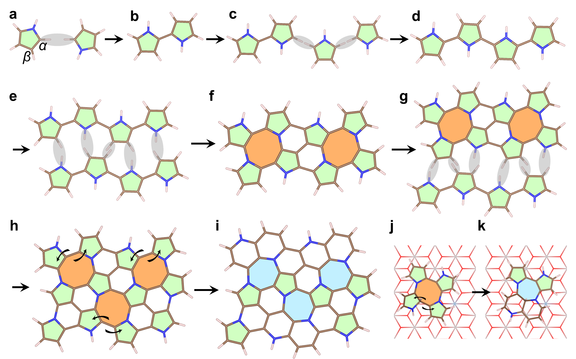 在这项研究中,由Beat365唯一官方网站郭林教授、刘利民教授研究团队及合作者等开创了一种全新的液相限域聚合方法。该方法通过层状模板的限域作用,抑制了分子聚合过程中的三维旋转和缠绕,使分子在二维平面内发生聚合,突破了吡咯单体在传统聚合中局限于α-C位点交联的限制,促进了β-C和N位点的交联聚合,构成平面网络结构,最终形成了五、六、七元环共存的二维非晶结构,成功在实验上验证了W. H. Zachariasen和Steven G. Louie提出的理论预测。