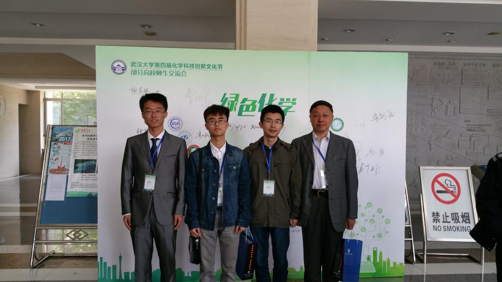 4月22日上午,Beat365高秋明教授带领2014级本科生苗伟宁、蓝昊和杨焱参加了武汉大学举办的第四届“化学科技创新文化节”部分高校师生交流会。此次交流会共有来自吉林大学、南京大学、哈尔滨工业大学、武汉大学等18所高校本科生队伍参与。
