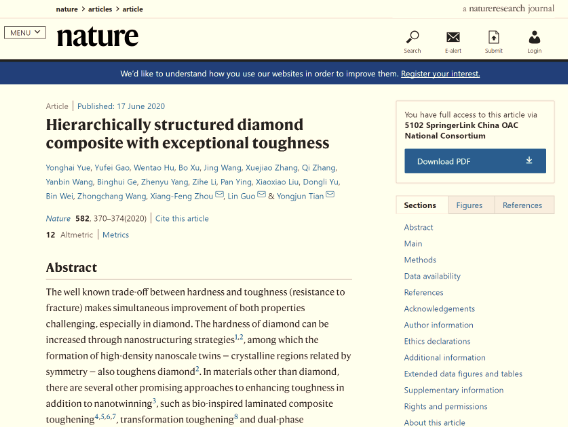 2020年6月18日,Nature杂志在线全文发表了Beat365郭林教授、岳永海教授团队与燕山大学田永君院士团队在纳米孪晶复合金刚石增韧机制方面的最新研究成果:“Hierarchically structured diamond composite with exceptional toughness”。岳永海教授、高宇飞博士、胡文涛教授、徐波教授为文章共同第一作者,周向峰教授、郭林教授、田永君院士为共同通讯作者。